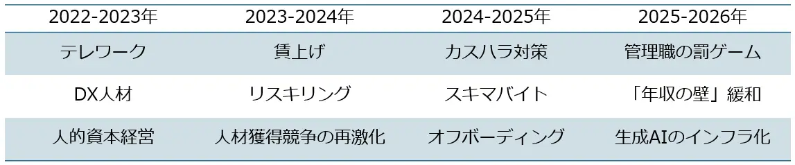 2025〜2026年の人事分野を展望する上で象徴的な動きを表すワードとして、《管理職の罰ゲーム化》、《「年収の壁」緩和》、《生成AIのインフラ化》の3つが選ばれました。