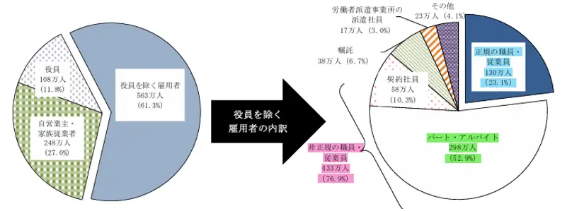 2024年の65歳以上の就業者を従業上の地位別にみると、役員を除く雇用者が563万人で65歳以上の就業者の61.3%、自営業主・家族従業者が248万人で同27.0%、会社などの役員が108万人で同 11.8%となっています。さらに65歳以上の就業者のうち役員を除く雇用者を雇用形態別にみると、 正規の職員・従業員が130万人で23.1%、非正規の職員・従業員が433万人で76.9%を占めており、 うちパート・アルバイトが298万人で52.9%となっています。(図7)