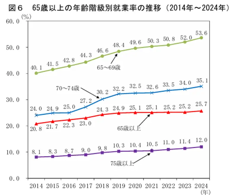 2024年の65歳以上の就業率(※2)は25.7%となり、前年に比べ0.5ポイント上昇しました。 年齢階級別(※3)にみると、65~69歳は53.6%、70~74歳は35.1%、75歳以上は12.0%と、いずれも過去最高となっています。(図6) ※2 65歳以上の就業率は、65歳以上人口に占める65歳以上の就業者の割合 ※3 年齢階級別就業率は、各年齢階級の人口に占める就業者の割合