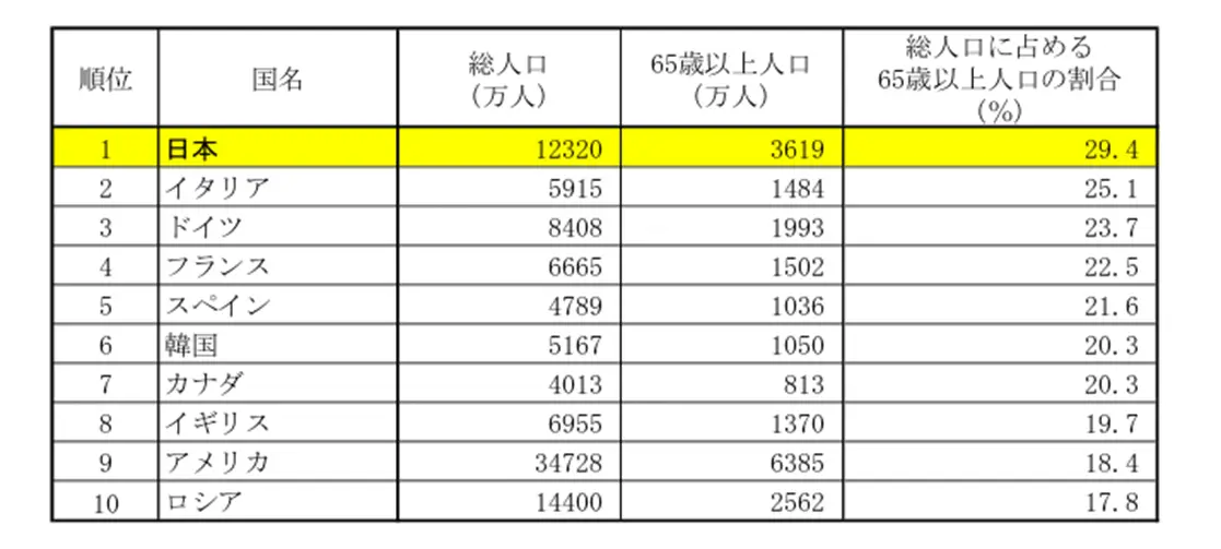 表1 65歳以上人口の割合(上位10カ国)2025年