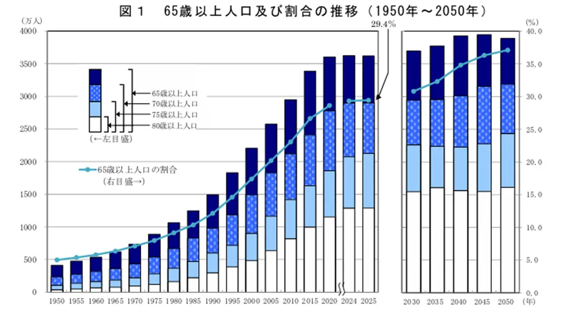 我が国の65歳以上人口(2025年9月15日現在推計)は、3619万人と、前年(3624万人)に比べ5万人の減少となりました。一方、総人口に占める割合は29.4%と、前年(29.3%)に比べ0.1ポイント上昇し、過去最高となりました。総人口に占める65歳以上人口の割合の推移をみると、1950年(4.9%)以降一貫して上昇 が続いており、1985年に10%、2005年に20%を超え、2025年は29.4%と過去最高を更新しています。国立社会保障・人口問題研究所の推計によると、この割合は今後も上昇を続け、第2次ベビーブーム期(1971年~1974年)に生まれた世代が65歳以上となる2040年には34.8%、2050年には37.1%になると見込まれています。(図1)