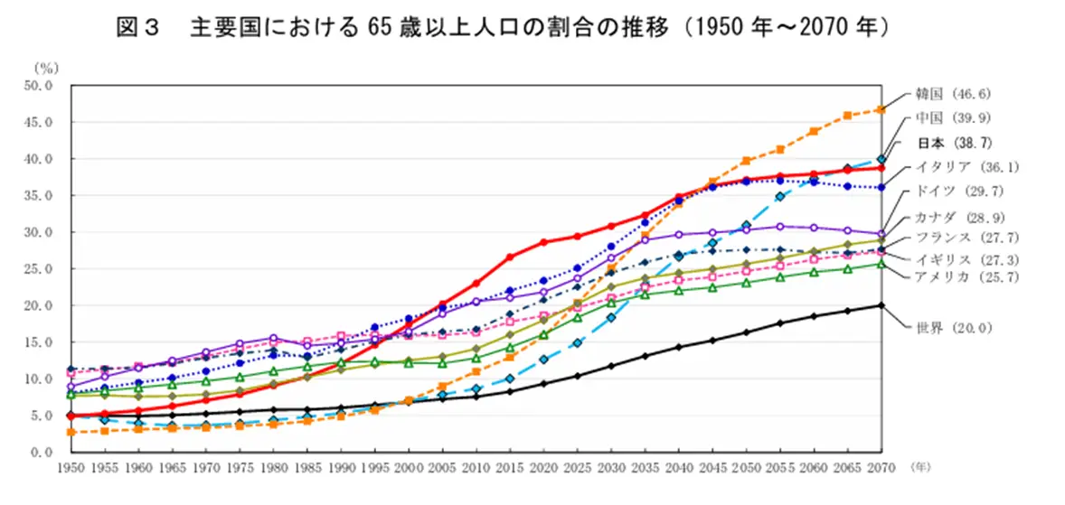 - 日本の65歳以上人口の割合は、世界で最高(人口4000万人以上の38か国中)