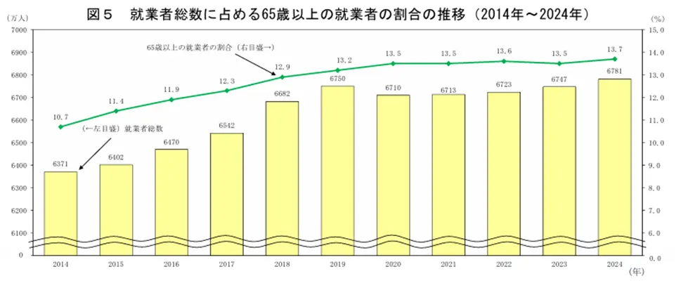 また2024年の15歳以上の就業者総数に占める65歳以上の就業者の割合は13.7%と、前年に比べ0.2ポイント上昇し、過去最高となっています。就業者のおよそ7人に1人が65歳以上となっています。(図5)