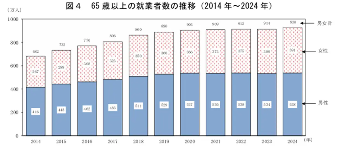 2024年の65歳以上の就業者数(※1)は、2004年以降、21年連続で前年に比べ増加し、930万人と過去最多となっています。(図4) ※1就業者とは、月末1週間に収入を伴う仕事を1時間以上した者、又は月末1週間に仕事を休んでいた者