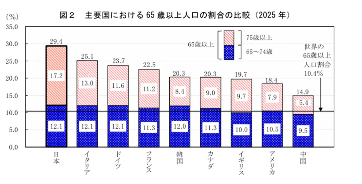 人口4000万以上の38か国について、2025年の総人口に占める65歳以上人口の割合を比較すると、 日本(29.4%)が最も高く、次いでイタリア(25.1%)、ドイツ(23.7%)、フランス(22.5%)となっています。(表1)