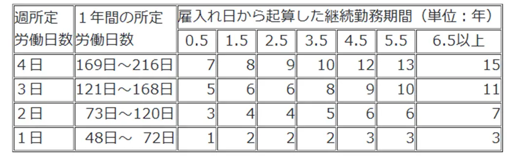 パートタイム労働者など、所定労働日数が少ない労働者についても年次有給休暇は付与されます。 週所定労働日数が4日以下かつ週所定労働時間が30時間未満の労働者の付与日数