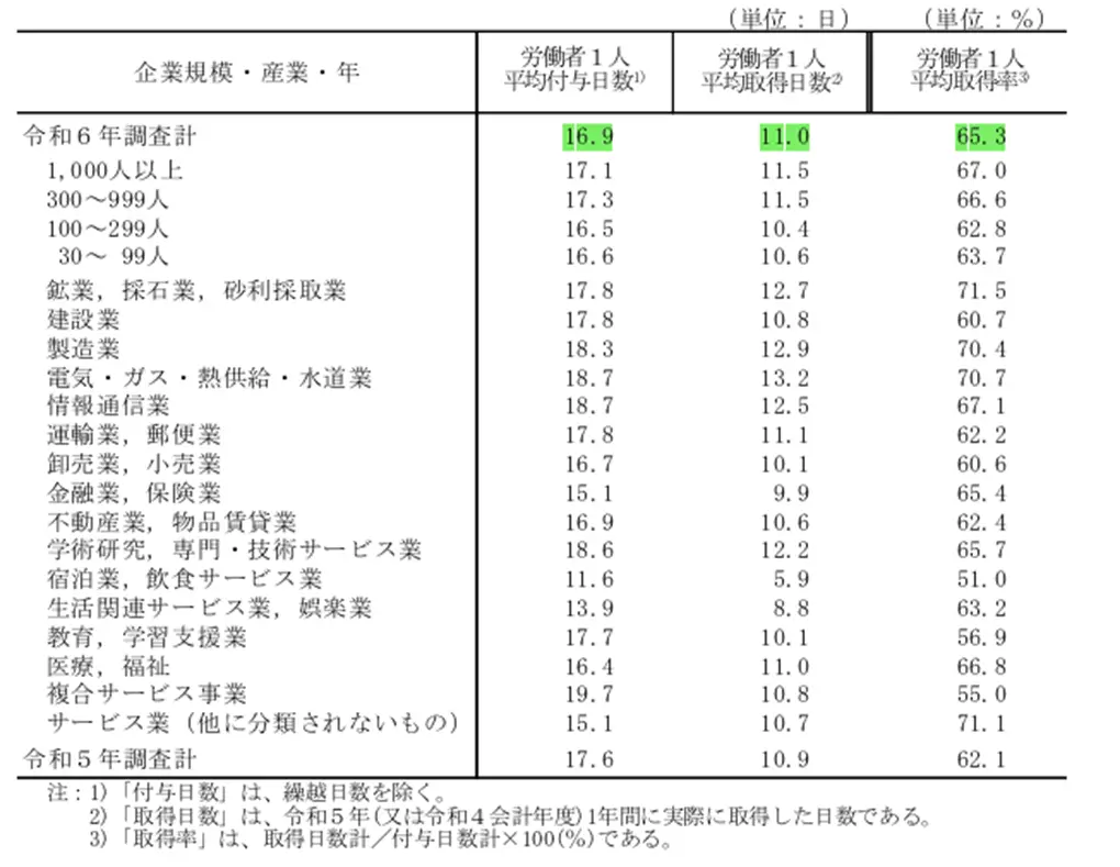 令和5年1年間に企業が付与した年次有給休暇日数(繰越日数を除く。)をみると、労働者1人平均は16.9日(令和4年 17.6日)、このうち労働者が取得した日数は11.0日(同 10.9日)で、取得率は65.3%(同 62.1%)となっており、昭和59年以降最も高くなっています。取得率を産業別にみると、「鉱業,採石業,砂利採取業」が71.5%と最も高く、「宿泊業,飲食サー ビス業」が51.0%と最も低くなっています。