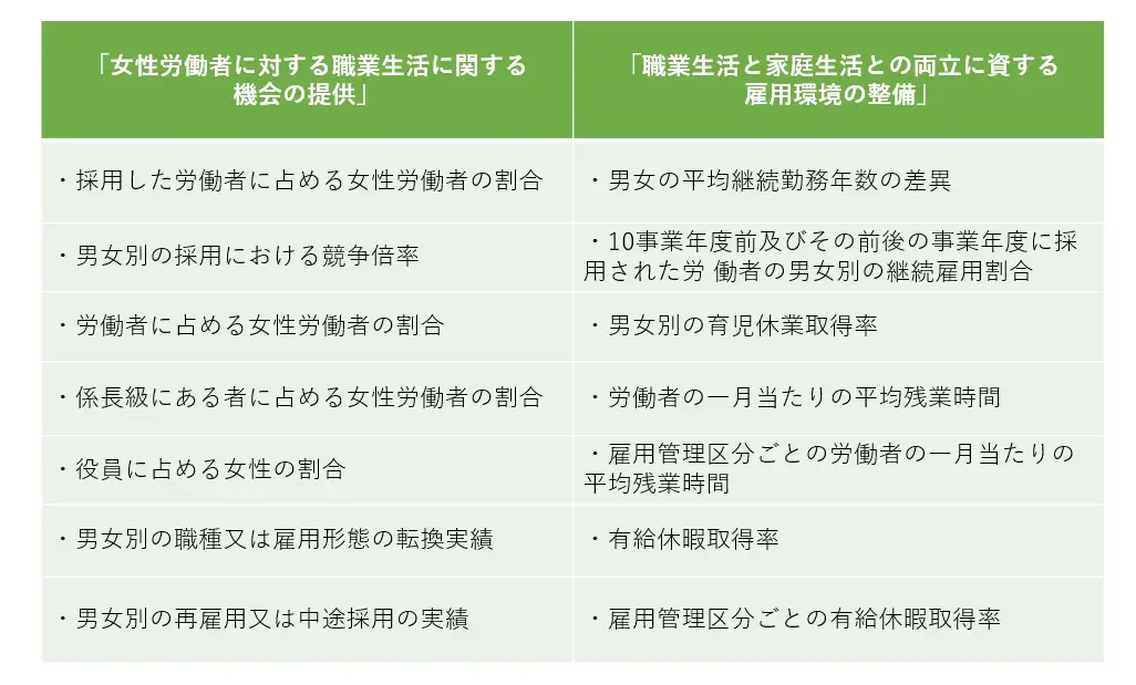 女性活躍の状況を把握する指標として、管理職に占める女性労働者の割合も公表項目の一つとされています。