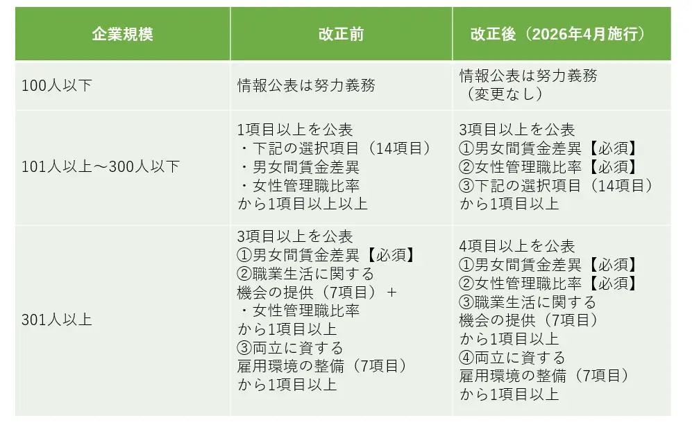 今回の改正により、情報公表の内容は企業規模に応じて次のように整理されています。