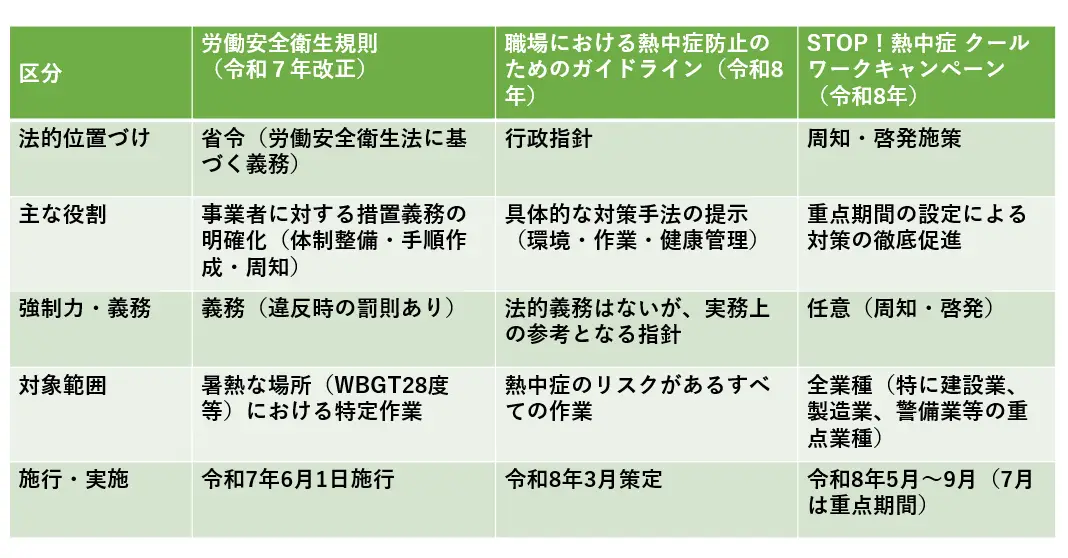 これに対し、令和8年に示されたガイドラインでは、暑熱環境の把握および作業方法の調整、健康状態に応じた配慮等について、現場での具体的な実施方法が示されています。